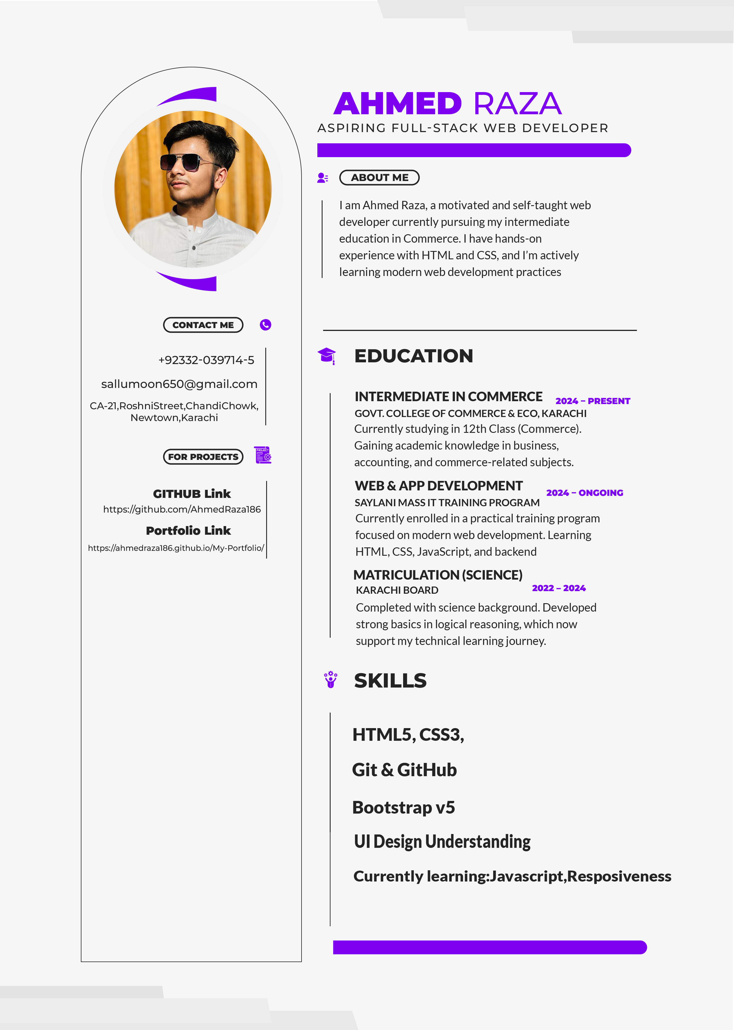 I'm Ahmed Raza, a passionate self-taught developer currently pursuing my intermediate in Commerce. I love building modern web experiences using HTML, CSS, JavaScript, and I’m expanding my knowledge in backend as well.